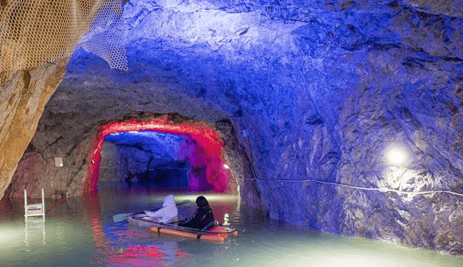 일제 강점기에 개발된 국내에서 유일한 활석광산으로 기록상으로는 57km, 비공식 기록으로는 87km에 이르고 지하 수직깊이는 711m로 동양 최대크기의 동굴입니다. 이 중 2.5m를 관광지로 개발하여 조형물과 건강세러피, 공연장 등을 조성하였고 LED 네온 빛과 자연의 빛이 한데 어우러져 오묘하고 신비로운 분위기를 자아냅니다.