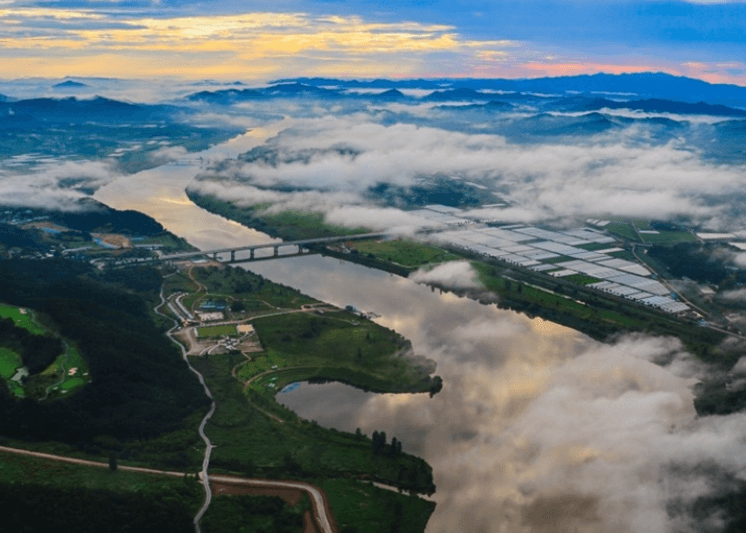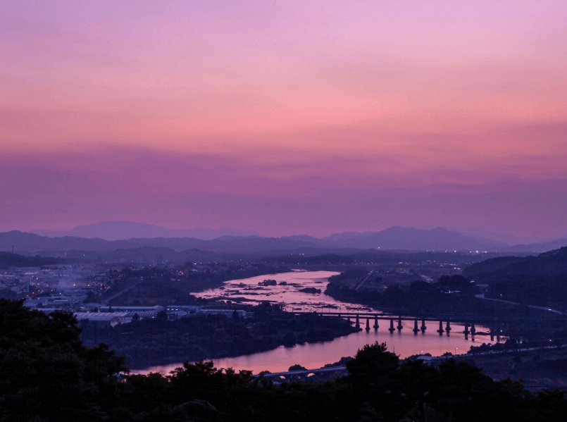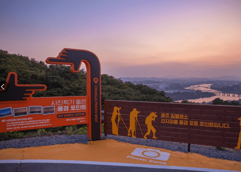 충청북도 청주시에 위치한 건지마을은 전국의 유명한 해넘이 명소 중 하나입니다. 늦은 오후부터 물드는 연한 황금빛 노을과 함께 자그마하면서도 푸근한 마음을 안겨주는 소담스러운 건지마을, 그 너머로 펼쳐지는 수묵화같이 점차점차 옅어지는 산세가 어우러진 풍경은 평온함 그 자체입니다. 건지마을에서 가장 아름답고 포근한 석양을 맞이할 수 있는 곳은 마을로 들어가는 오르막길 중간에 있으며 "사진 찍기 좋은 풍경 포인트"라는 팻말과 함께 "포토존" 표시가 있어 찾아가기는 매우 수월합니다. 특히 봄, 가을 태양 일몰 지점과 S자형 남한강물로 떨어지는 일몰은 저절로 탄성을 자아내게 합니다.