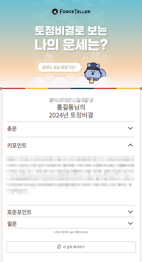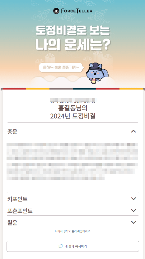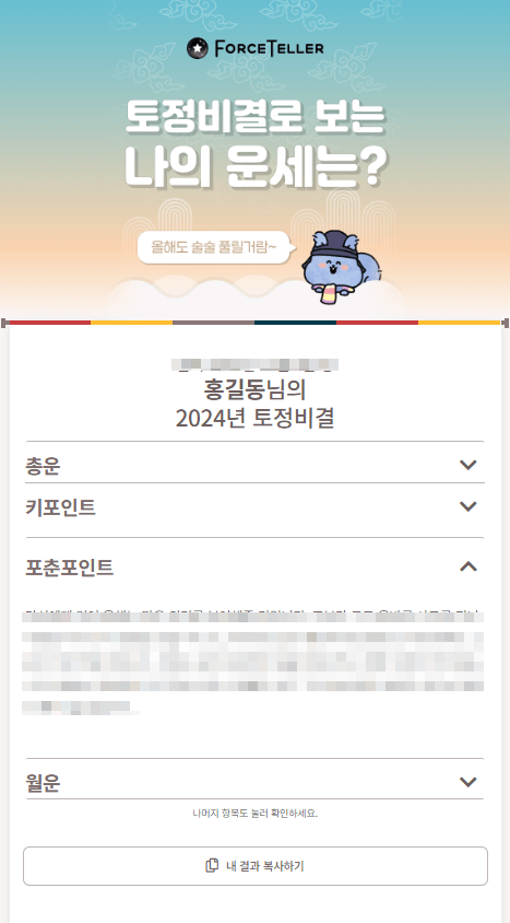 포스텔러의 토정비결 결과화면입니다.