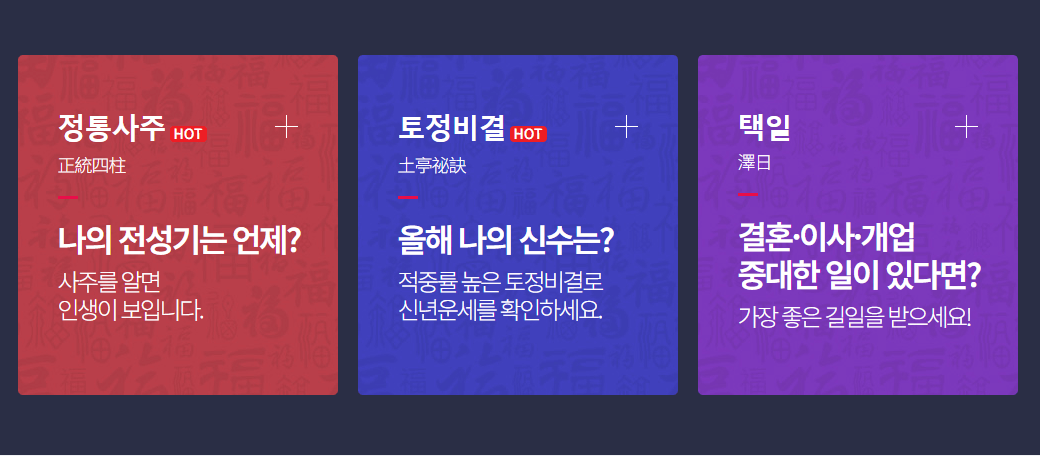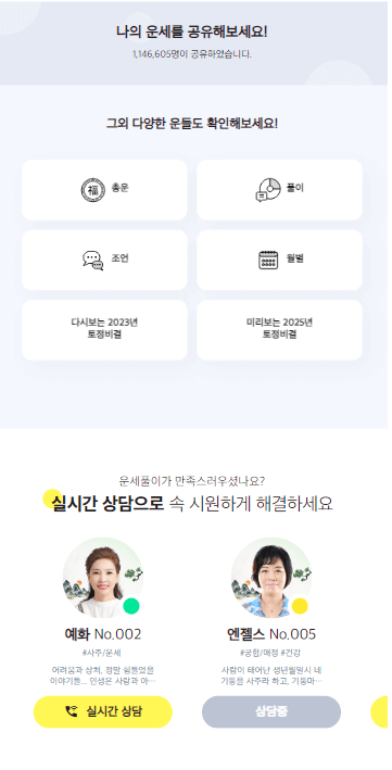 토정비결은 물론 내일의 운세부터 궁합까지 궁금해하는 가장 사소한 것도 놓침 없이 모두 알려줍니다.
