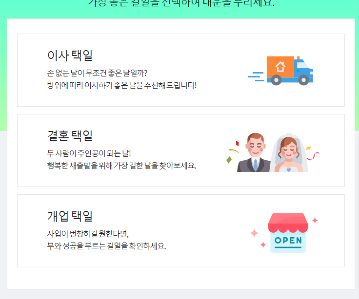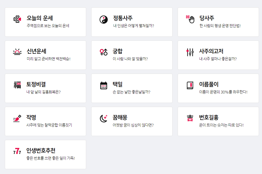 전반적인 총운과 월별운을 제공하며 정통사주, 택일까지 꽤 다양한 서비스를 모두 무료로 제공하고 있습니다.