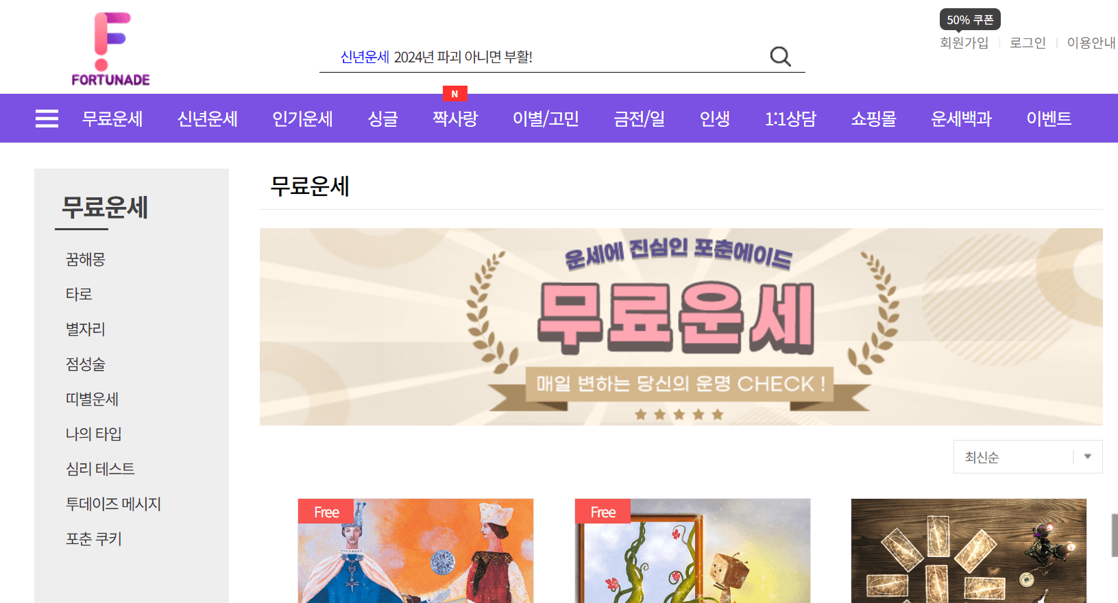 좌측 메뉴를 클릭과 동시에 아래와 같이 FORTUNADE페이지로 이동하고 메뉴화면 좌측에 무료운세가 대기하고 있습니다.